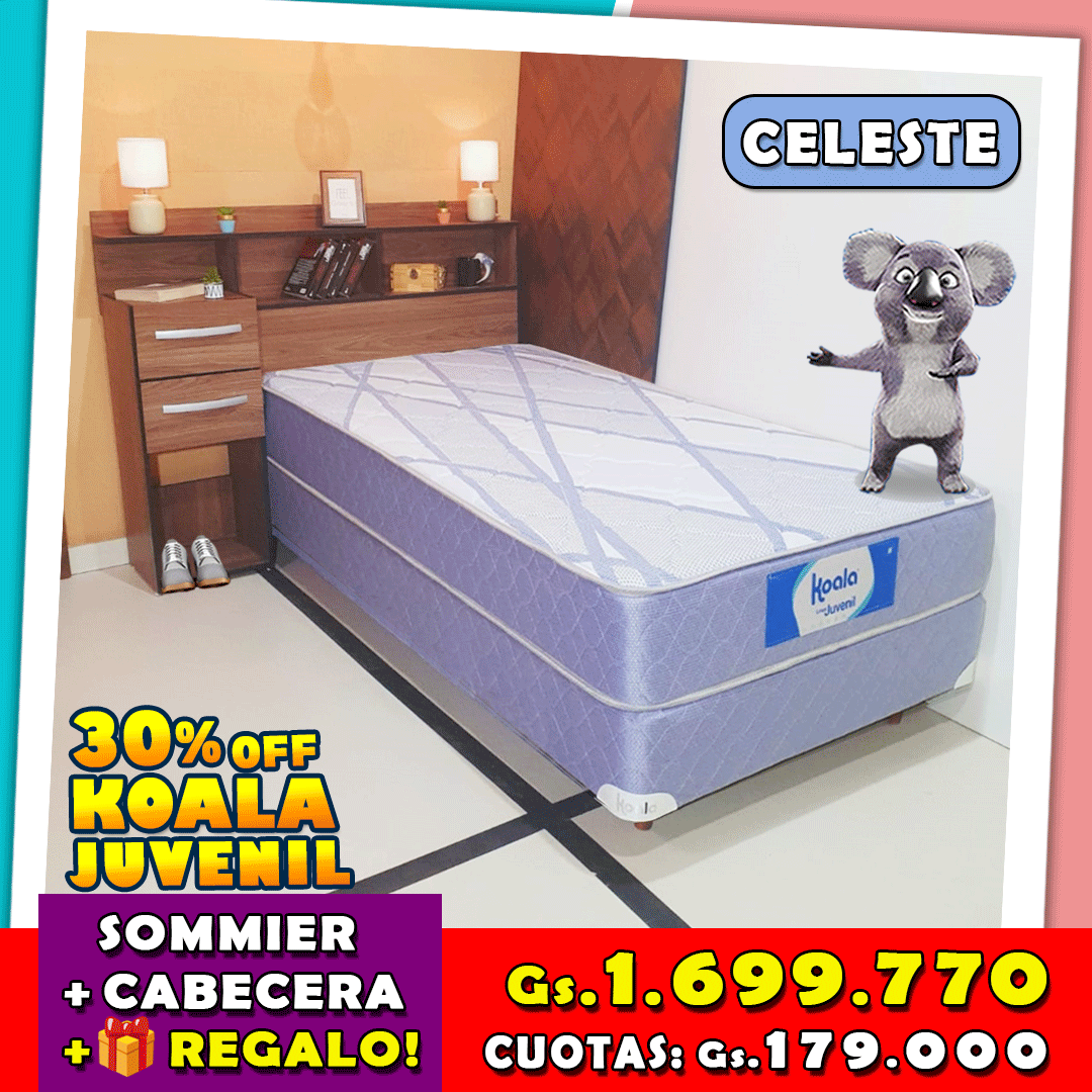 Koala Juvenil 100×190 Celeste + Cabecera Fantastica con Multi-estantes y Multicajones