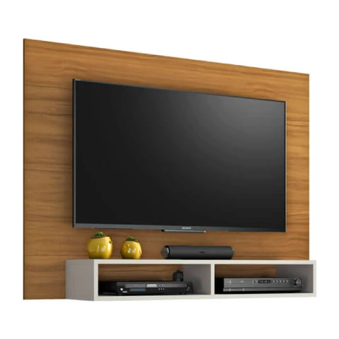Cuenta con nichos para electrónicos y permite fijar la TV directamente en el panel, soportando televisores de hasta 43″, combinando practicidad y diseño moderno.