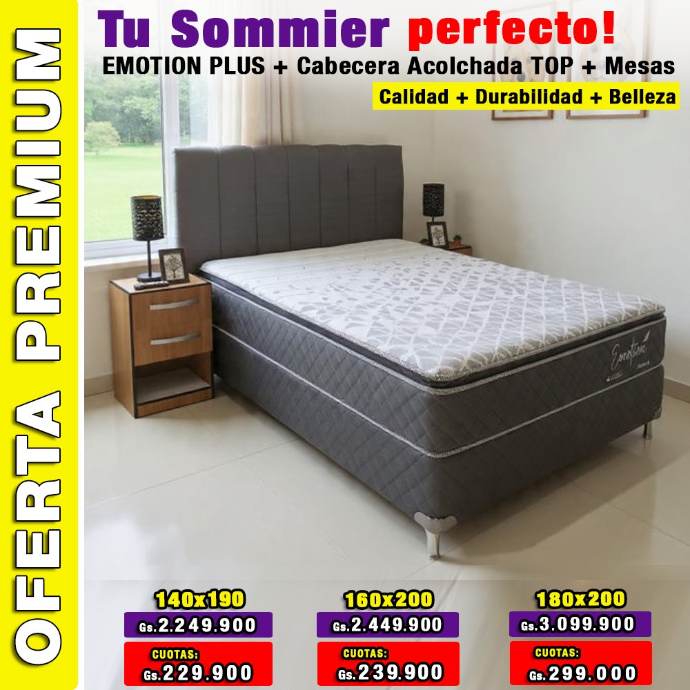 SOMMIER EMOTION PLUS + CABECERA ACOLCHADA + MESAS (3 tamaños)